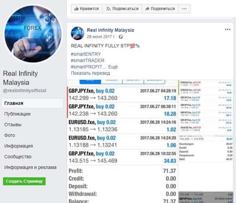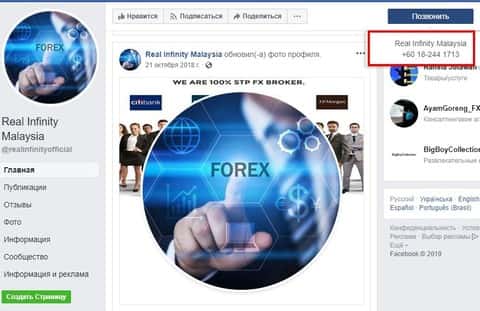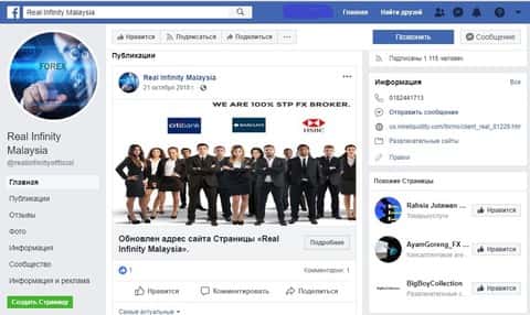 Однодневная помойка Real Infunity за столь короткий срок существования не успела набрать достаточное количество отзывов, что бы они были доступны в поисковике. Одним из оставшихся источников существования шулеров Реал Инфинити есть страница в социальной сети Facebook. Зайдя на эту полуподвальную страницу в глаза кидаются довольно плохие картинки на постах и самой странице. Несмотря на тысячу накрученных подписчиков на постах группы мошенников Real Infinity около нулевое значение лайков, что свидетельствует об краткосрочной деятельности брокера.