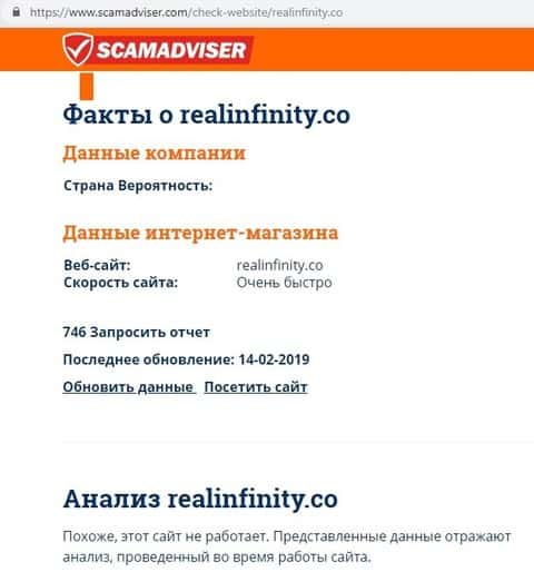 Воспользовавшись услугой сайта scamadviser com, мы можем узнать его мнение по поводу шулеров Реал Инфинити. С содержимого страницы можно узнать, что данную страницу опытные пользователи проверяли на вшивость много раз. Это свидетельствует о том, что еще во время активности сайта пользователи уже перестали доверять жуликам Real Infinity. И как можно узнать сейчас они не прогадали. Скамадвайзер ком предупредил их о высоких рисках и ненадежности сайта лохотрона Реал Инфинити.