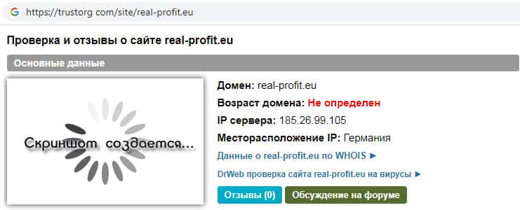 На информационном сайте trustorg com была произведена проверка ip-адреса мошеннической организации Реал Профит. Выяснилось, что возраст домена сайта данной псевдо-брокерской организации определить невозможно. Доверять подобным сомнительным непроверенным и не надежным скам-конторам не рекомендуем !!!