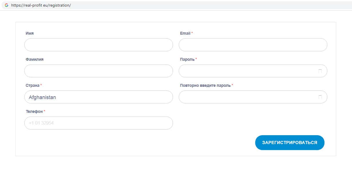 Для того, чтобы зарегистрироваться на сайте мошенников Реал Профит необходимо назвать имя, фамилию, адрес электронной почты и пароль, а так же страну проживания. Зарегистрировавшись на фальшивом сайте скам-брокера Real-Profit Eu Вы автоматически соглашаетесь со всеми условиями пользования сайтом.