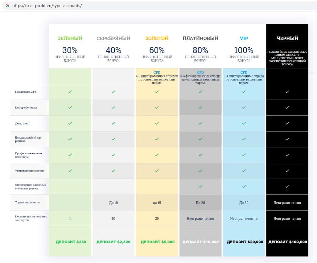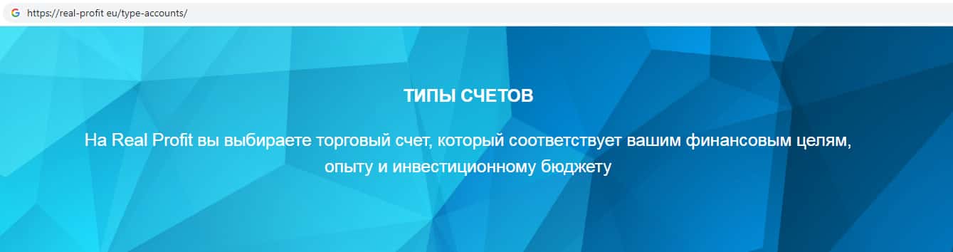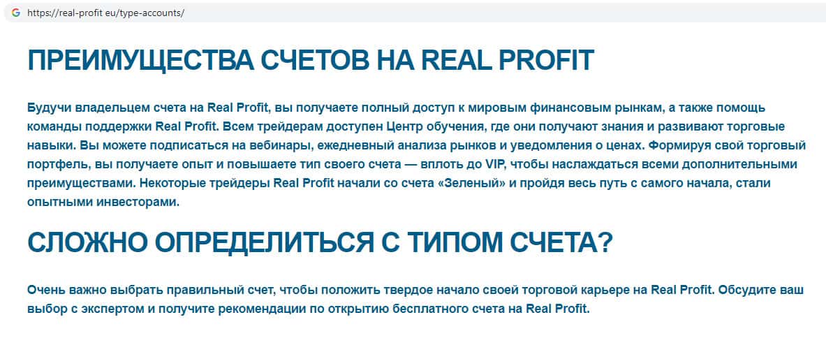 - Типы торговых счетов представленных на сайте скам-брокера Real-Profit Eu