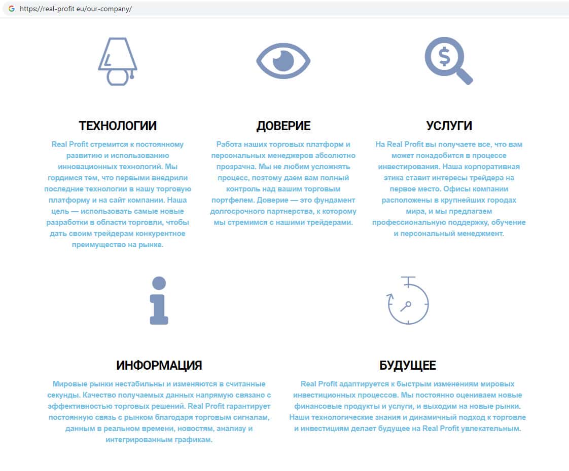 Жулики Real-Profit Eu предоставляют возможность пользователям сайта ознакомиться с историей создания их организации. Подобные конторы зачастую используют данную ловушку рассказывая о том какие достижения были, и конечно же о том какой красивый у них офис. Верить мошенникам Реал Профит нельзя, а вкладывать свои деньги на их сайте тем более !!!