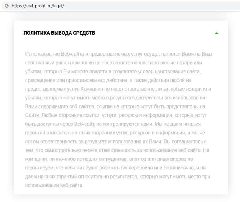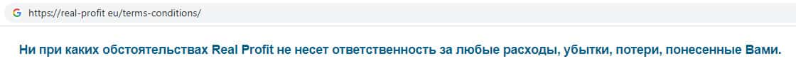Шулера Реал Профит не несут никакой ответственности за какие-либо убытки клиента, включая то, что на их дырявом сайте невозможно вернуть свои вложенные денежные средства, и конечно же обещанную прибыль. Задумайтесь, прежде чем принимать такое решение регистрироваться на сайте скам-брокера Real-Profit Eu !!!