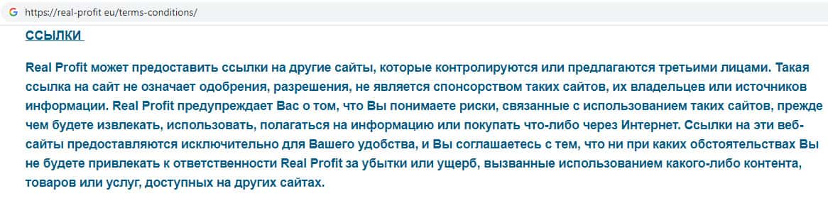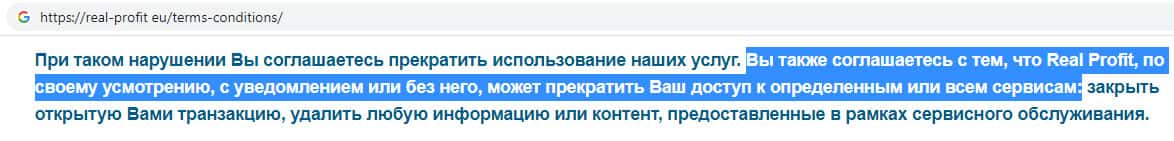 Пользовательское соглашение жульнической конторы Реал Профит