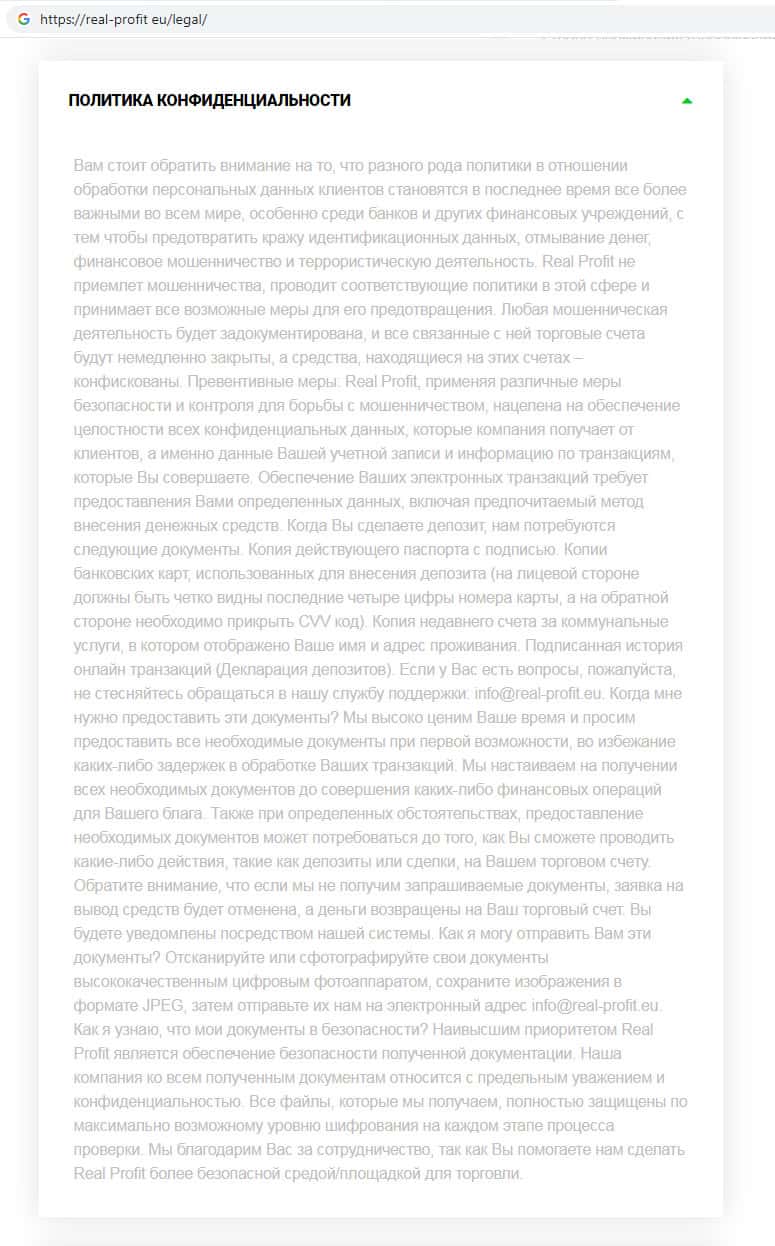 - Политика конфиденциальности псевдо-брокерской организации Реал Профит