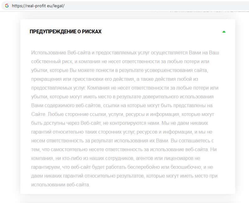 - Информация о всевозможных рисках на сайте скам-организации Real-Profit Eu