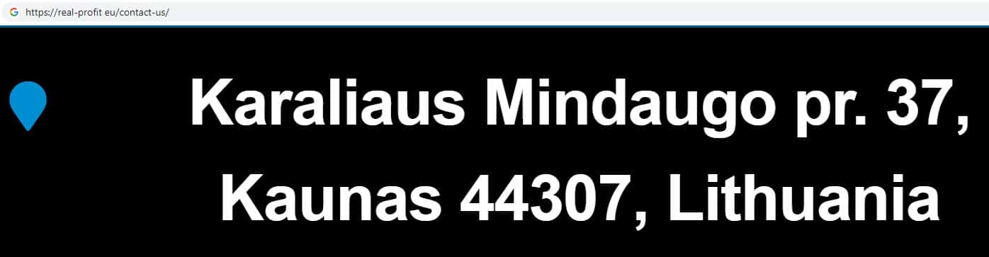 Согласно контактной информации, которую указывает о себе, главный офис мошеннической организации Реал Профит находится в Литве по адресу: Karaliaus Mindaugo pr. 37, Kaunas 44307, Lithuania. Где ныне базируется огромное количество аналогичных компаний.