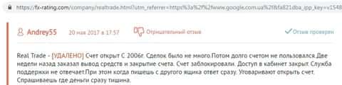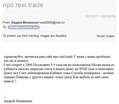 Человек обратился к нам за помощью, жулики брокерской конторы Real Trade обворовали его без стыда и совести. Мужчина давно уже открывал у них счет, почти 10 лет назад. Он вложил 800 долларов и собственноручно слил весь депозит, оставалось только 17 долларов. Жулики решили привлечь его внимание и дали 50 долларов бонуса на счет. Через много лет он вернулся в торговлю на рынок Форекс и ему удалось разогнать свой счет в огромную сумму. В последний раз, когда он заходил, на счету было около 200 долларов. Мужчина в этом году вспомнил, что у него лежат там деньги и решил вывести себе на банковскую карту. Но как оказалось его счет уже давно заблокировали, хотя письма с рассылкой приходят до сих пор. Жулики перестали отвечать на звонки и письма, а доступа к счету так и нету.
