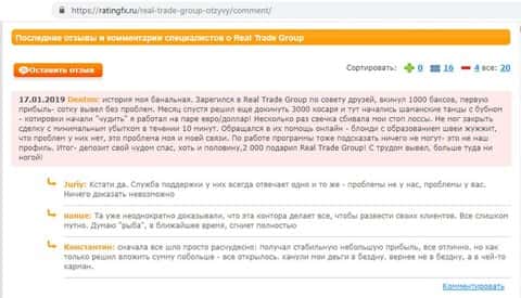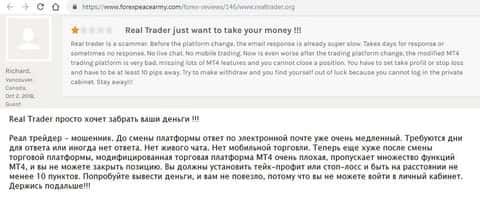 О том, что Real Trade – это реальный лохотрон пользователь, оставивший отзыв на forexpeacearmy com, знает не понаслышке. Мошенники желают лишь разживиться за счет своих клиентов, но уж никак не дать им заработать на форексе.