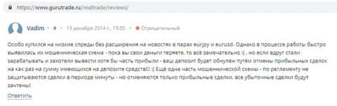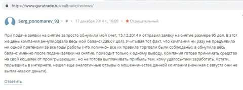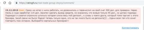 Трейдер, оставивший жалобу на портале рэйтингфх ру, схватил шпильку от жуликов из Real Trade на 300 долларов. После зачисления денег, он увидел, что счет пошел в рост, и захотел вывести средства. Однако оказалось, что его депозит слит под ноль скам-брокером.