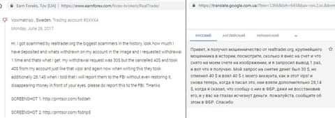 Скам-контора не стесняется разводить юзеров из разных стран. Житель Швеции в своей жалобе на портале earnforex com уверен, что Реал Трейд – крупнейший жулик в истории. Ему не дали вывести ни копейки, нагло слив счет прямо на глазах.