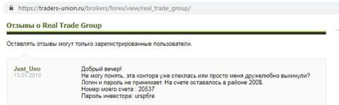 Бедный вкладчик Реал Трейд еще не знает, что лохотронщики кинули его на реальные деньги. С его счета слили 200 долларов и тотчас же заблокировали доступ к аккаунту. Жертва скаммеров оставила отзыв на на traders-union ru.