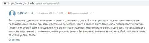 Портал gurutrade ru просто пестрит жалобами на проходимцев Real Trade. Шарашкина контора, которая наживается на своих вкладчиках, вот что на самом деле представляет собой Реал Трейд. Как только трейдер попытается вывести свои средства с их платформы, он тут же поймает лося и останется в просадке.