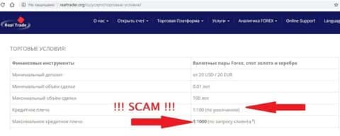 Распознать в брокере финансовую пирамиду можно по разным признакам, например, по размеру кредитного плеча. Чересчур высокие значения этого показателя (выше 1:30) – первое свидетельство того, что перед вами мошенники. Левередж Real Trade от 1:100 до 1:1000 говорит о том, что это явный скам.