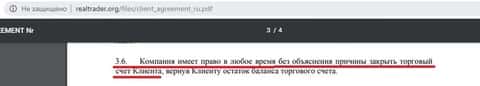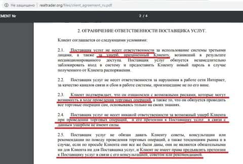 Шарага Real Trade имеет право вообще, не объясняя клиенту причины, заблокировать его торговый счет. Вторая же сторона не сможет ничего с этим поделать, ведь данный пункт прописан в мошенническом соглашении дилинговой кухни.По договору проходимцы из Real Trade ни за что не несут ответственности, в том числе и за возможный ущерб своего клиента. Вторая сторона не имеет права предъявлять претензии псевдорбокеру, а также признает все возможные риски, имея дело с этой системой.
