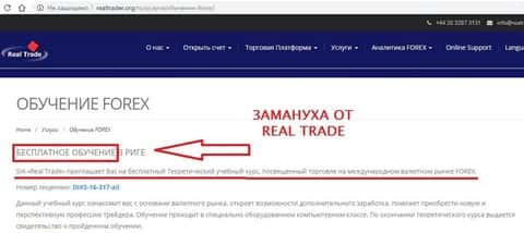 На сайте мошенников находим информацию о бесплатных обучающих семинарах – один из популярных способов находить доверчивых лопухов и выманивать из них деньги. Новичков склоняют открывать торговые счета на платформе шайки Real Trade, и затем сливают их деньги.