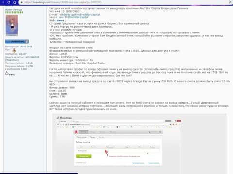 На другом портале, а именно forexdengi com клиент аферистов Red Star Capital рассказал о своей истории сотрудничества с ними. У него произошла стандартная ситуация, а конкретнее на него вышли сами мошенники Ред Стар Капитал с предложением начать торговлю в их конторе. Однако после потраченного на это время клиенту аферисты Red Star Capital все-таки отказали в выводе средств и упали на мороз. Полное описание ситуации находится на изображении ниже.