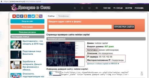 На веб-ресурсе довериевсети рф можно проверить сайт лохотрона Red Star Capital на предмет его возраста, домена и тп. Но помимо этого на этой веб-площадке можно размещать отзывы о проверяемом сайте. Именно так и сделал очередной облапошенный мошенниками Ред Стар Капитал клиент, который повелся на рекламу и звонки жуликов Ред Стар Капитал и так же слил в этой помойке свои деньги.
