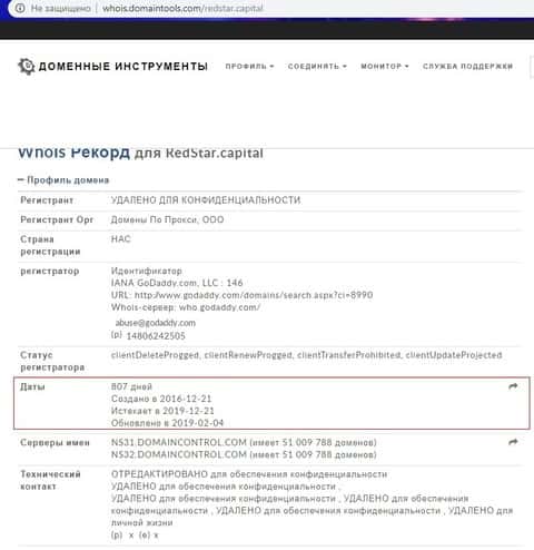 Очевидно, что сайт подвального лохотрона Ред Стар Капитал был заблокирован не спроста, ведь из-за отсутствия лицензии, или какого-либо регулирования, и фактов мошенничества на аферистов Red Star Capital посыпались жалобы от облапошенных клиентов, которые требовали вернуть украденные деньги. По информации с сайта whois domaintools com можно узнать, что сам домен шулеров Ред Стар Капитал был создан на несколько лет, но в связи с непредвиденными обстоятельствами мошенники Red Star Capital слились. Данный факт говорит о том, что особого смысла для получения лицензии у жуликов Ред Стар Капитал не было и они просто кидали людей на деньги, после чего слились раньше срока.