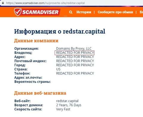 Не трудно догадаться, что для подобной у шулеров Red Star Capital деятельности очень высок риск сесть за решетку на долгие годы, в связи с чем как руководители, так и сами менеджеры аферистов Ред Стар Капитал, тщательно скрывают свою личность и контакты. Проверить данный факт так же можно на ресурсе scamadviser com, по информации которого можно узнать что мошенники Red Star Capital при аренде сервера ловко скрыли свою личность, а именно: владельцев, организацию, адрес, технические контакты и прочее. Не определяется точное местоположение сервера аферистов Ред Стар Капитал.