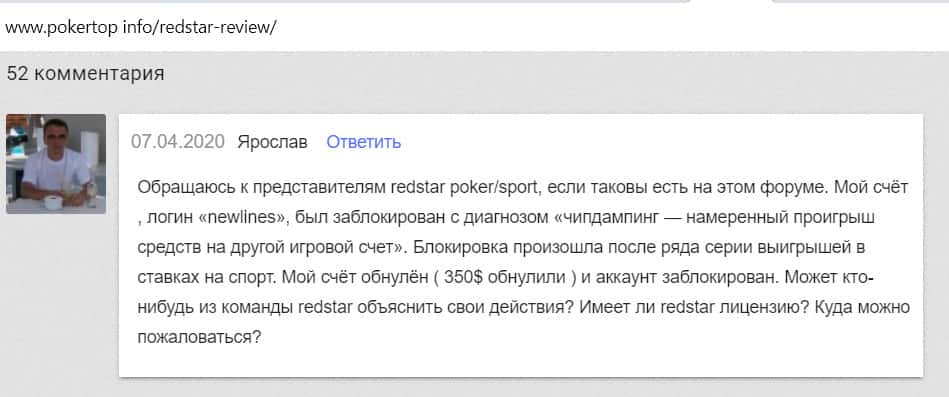 Мужчина описал ситуацию, как ему заблокировали аккаунт на Ред Стар Покер совершенно необоснованно. В результате он потерял 20 000 рублей вложенных и всю прибыль от игры.