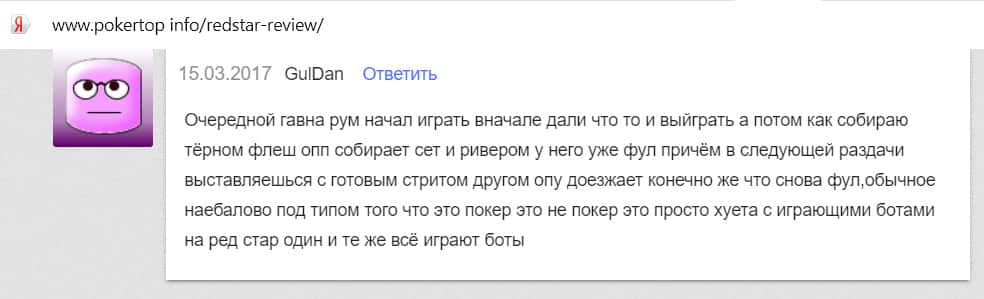 Очередной игрок пишет, что на сайте Ред Стар Покер лучше не играть, так как там невежливый саппорт и подставы. Рум ненадежный, его репутация сильно подмочена.