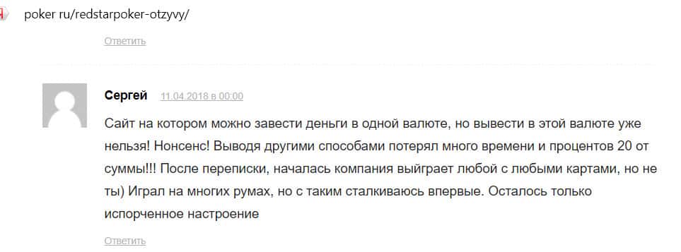 Сергей пищет, что на сайте Ред Стар Покер можно завести деньги в одной валюте, но вывести в ней же нельзя. Выводя другими способами теряешь очень много средств.