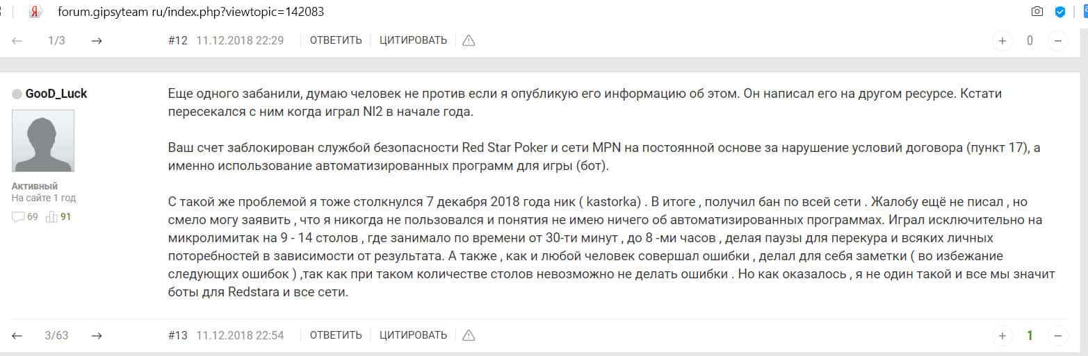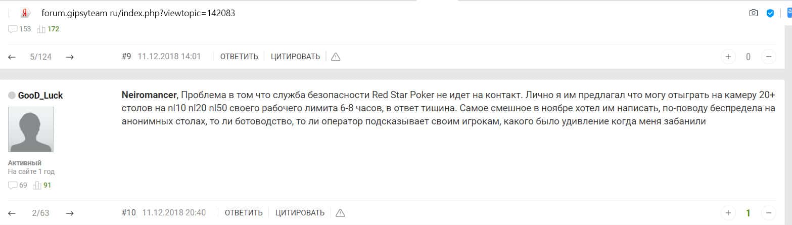 Игрок, которого также кинули мошенники из Ред Стар Покер, пишет, что на сайте проблемы со службой безопасности. Она не идет на контакт, просто тупо блокирует игроков.