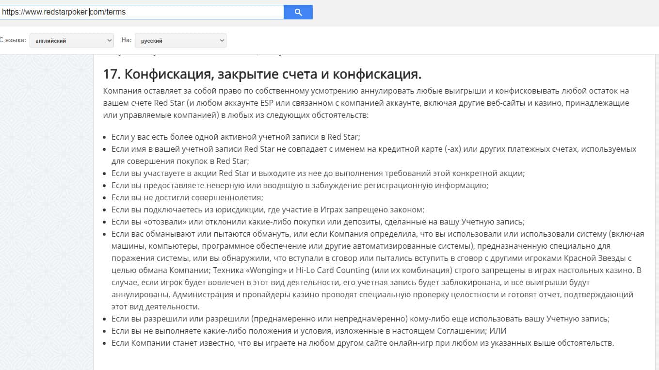 В пункте 17 клиентского соглашения компания RedStar Poker оставляет за собой право конфисковать или аннулировать ваши средства по своему усмотрению.