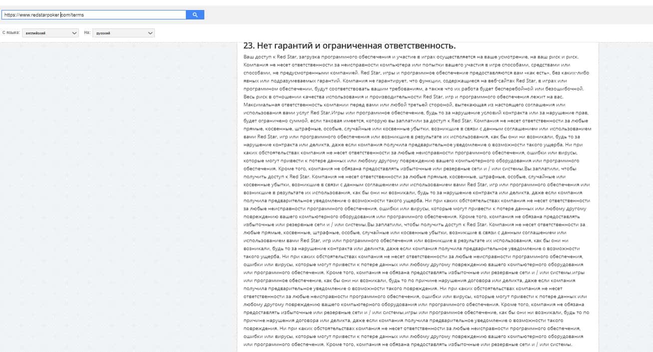 Пункт 23 говорит о том, что доступ пользователя к сайту RedStar Poker осуществляется на его страх и риск. Компания не несет ответственности абсолютно ни за что.