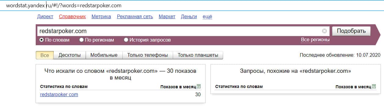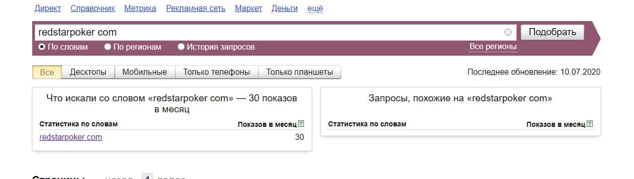 Проверка доменного имени "redstarpoker.com" на количество запросов на сайте Вордстат показала, что сайт искали всего лишь 30 раз за месяц.