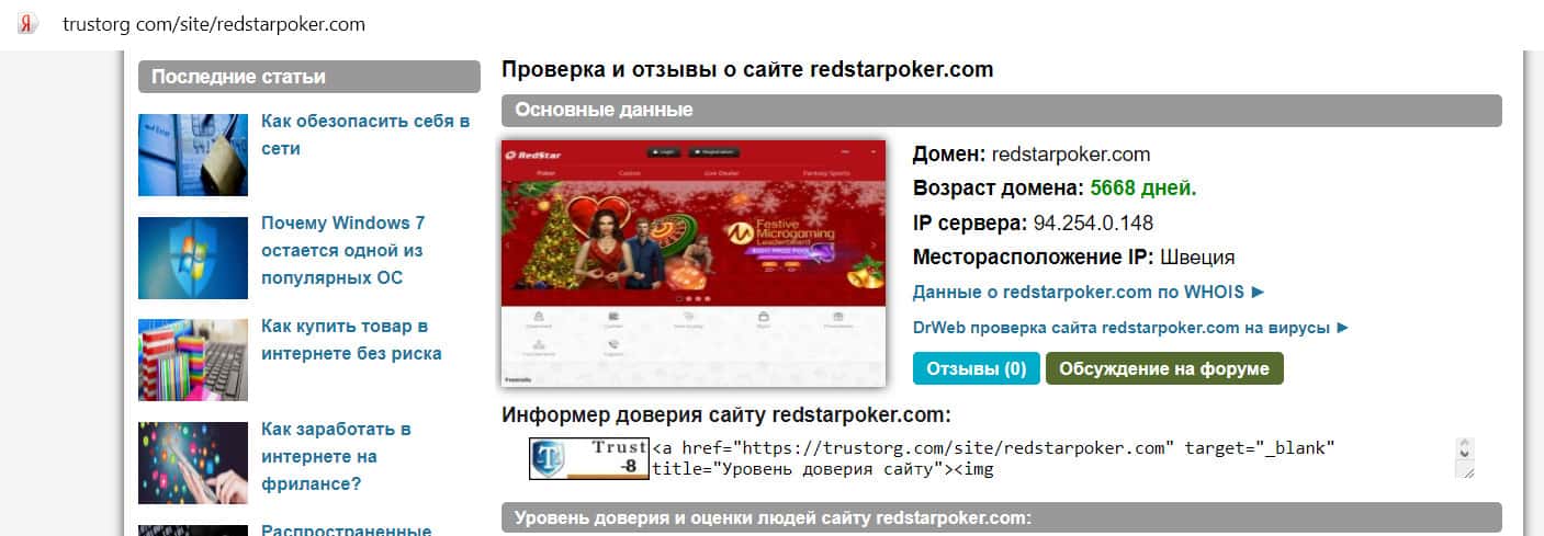 - Информация о сайте Ред Стар Покер на сервисе Трасторг