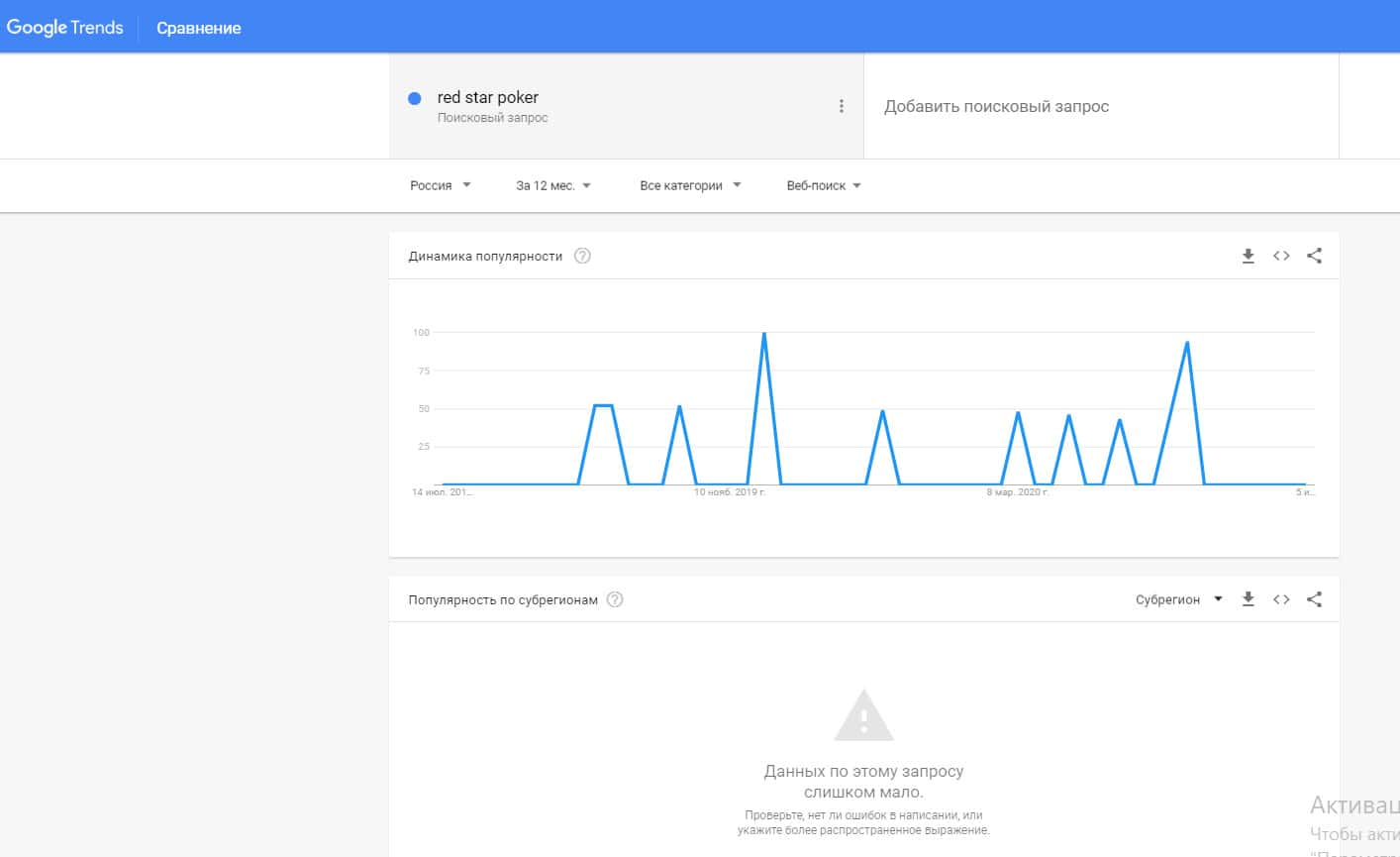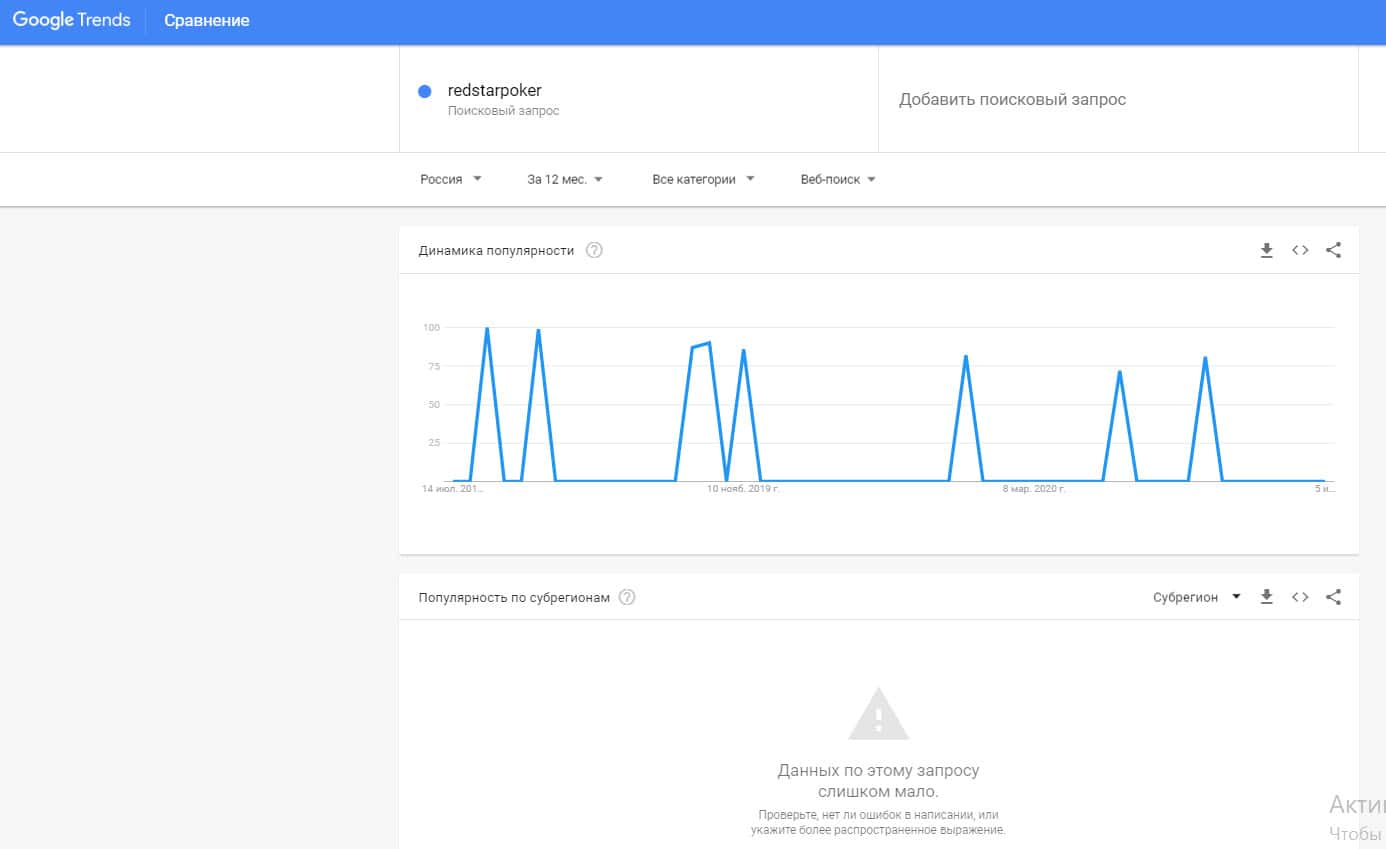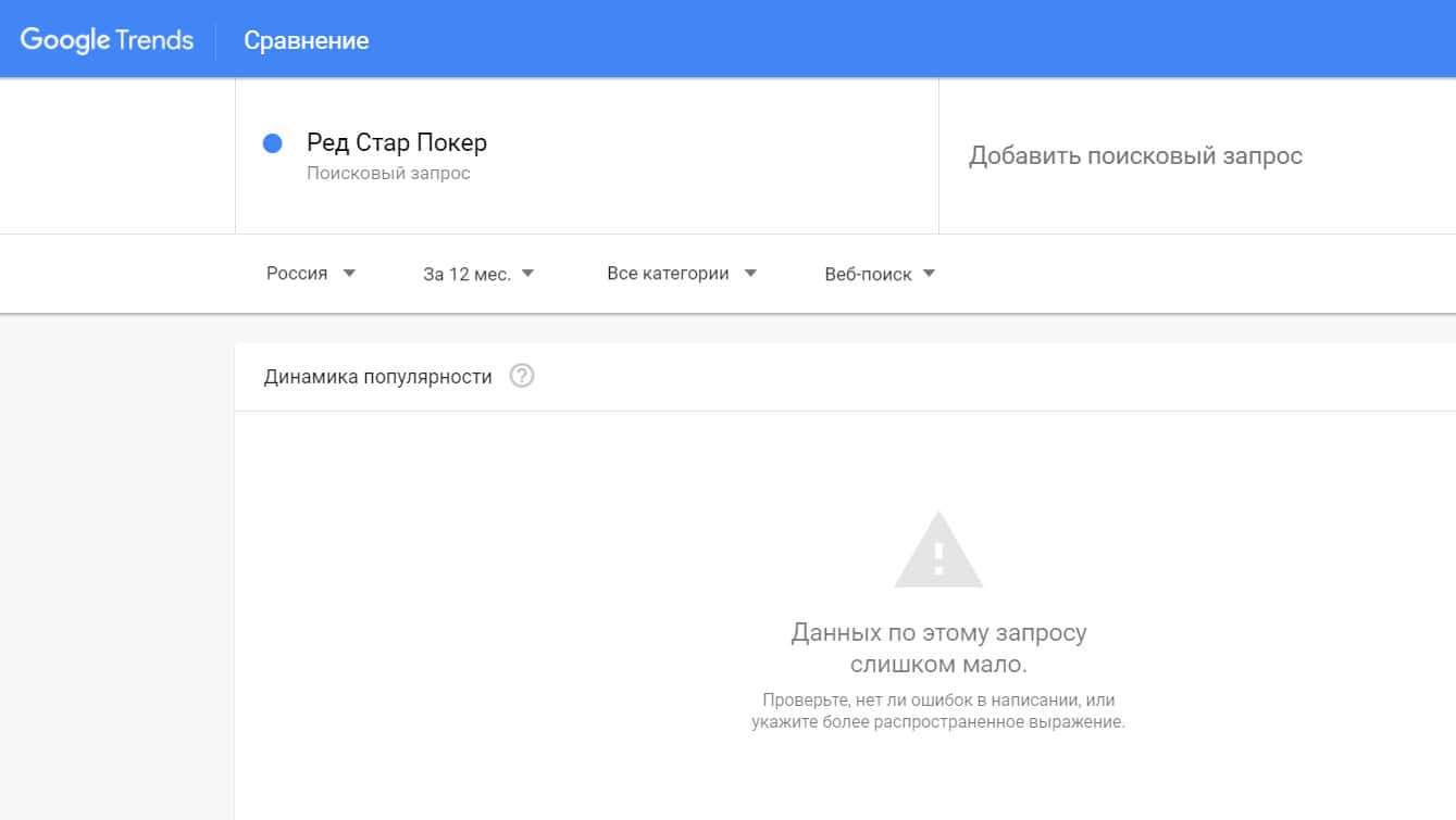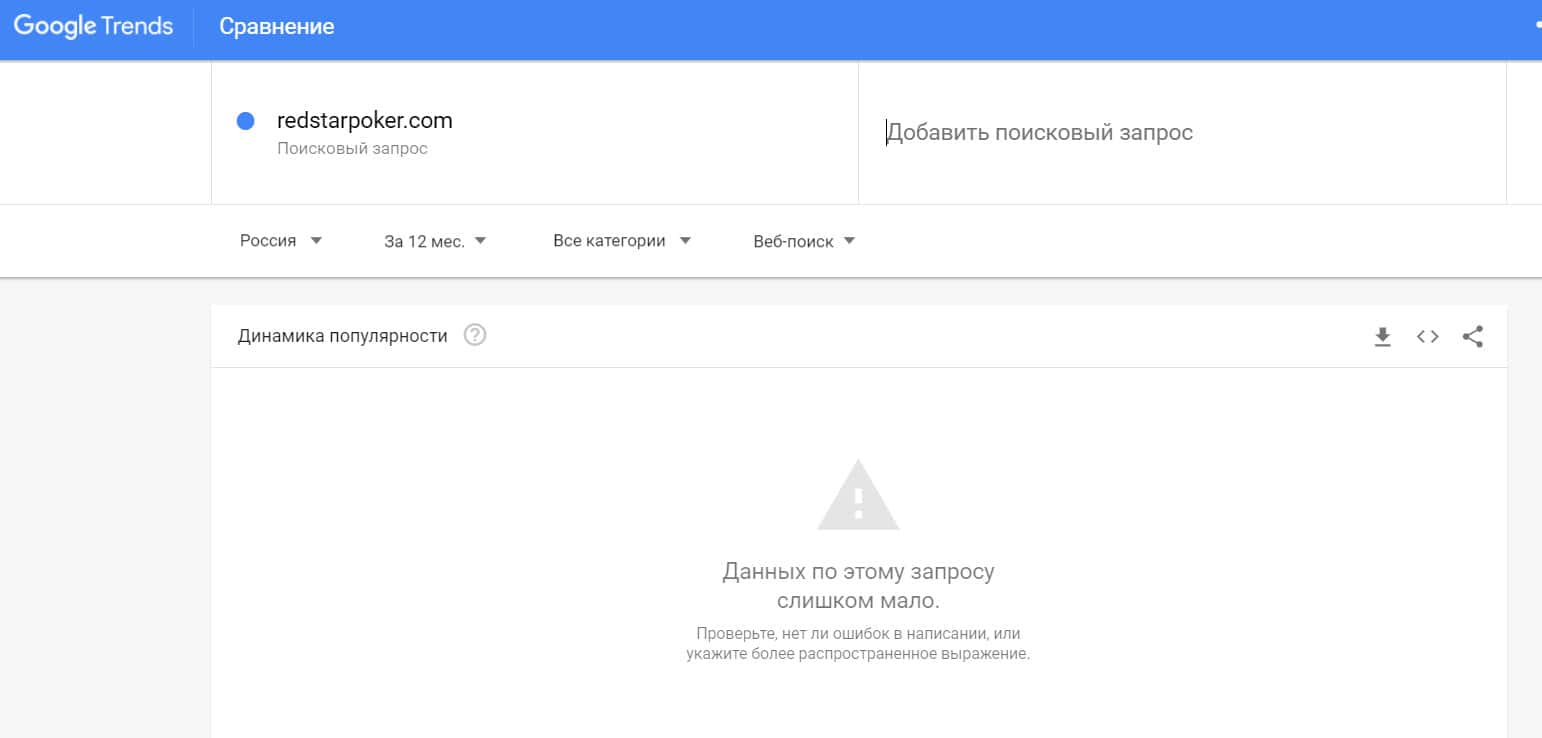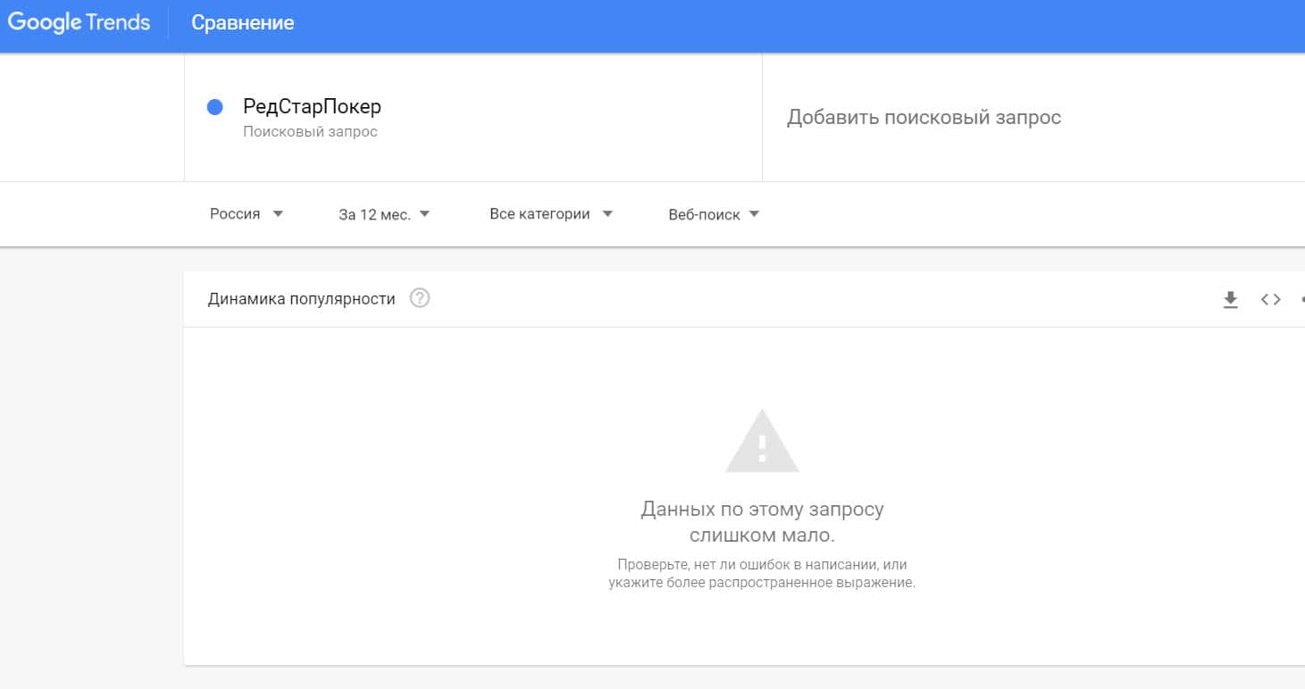 Посмотрим, сколько пользователей пытались найти бренд "redstarpoker" в системе Гугл, написав его без пробелов. Результат: очень мало данных.