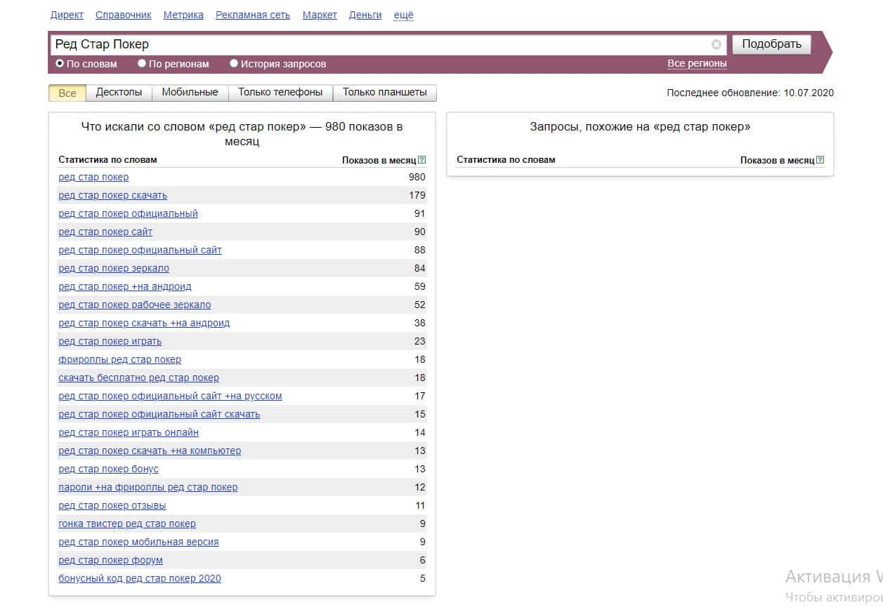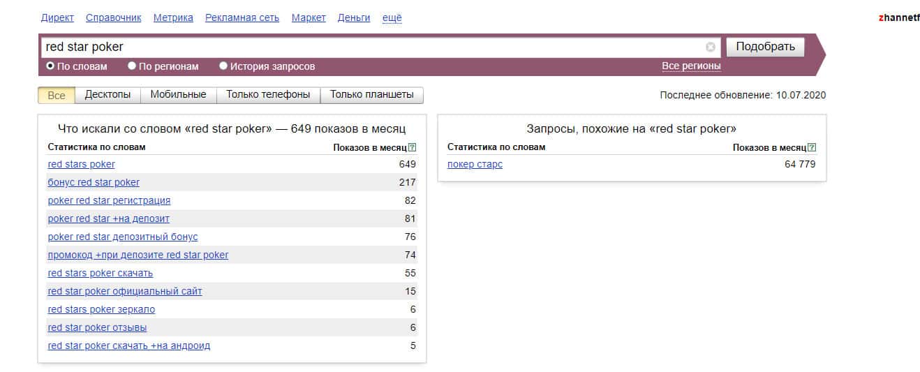 Причем, если писать все слова отдельно: "red star poker", то результат будет другим. Так сайт искали 649 раз.