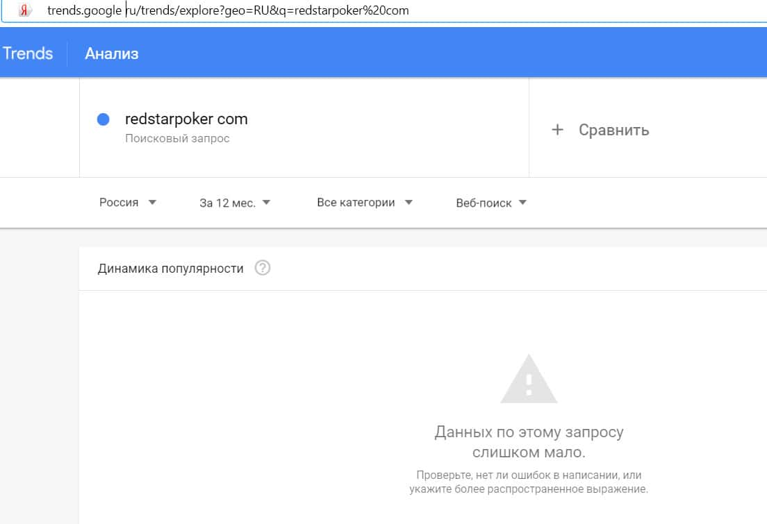 Проверка доменного имени "redstarpoker com" на количество запросов в сервисе Гугл показала, что пользователи вбивали это название слишком мало.