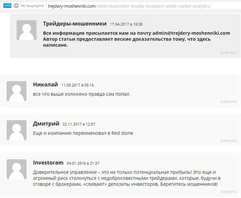 Вот несколько отзывов о работе конторы Ред Стон, которая уже закончила свое существование, но следы своей мошеннической деятельности раскидано по всему интернету в виде отзывов кинутых клиентов. Люди рассказывают что попались в лапы аферистам, а также, что контора World Market Analytics, была переименована на Red Stone. Следует быть осторожным при выборе брокера.