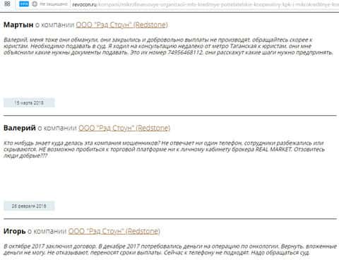 Очередная партия негативных отзывов о лохотронщиках Ред Стон. Вот человек рассказывает, что его обманули, так как контора закрылась, не компенсируя ничего. При чем стоит заметить, что личный кабинет открывался на торговой площадке Real Market. Возможно это одна из обслуживающих шарашкиных контор Red Stone, которую спокойно можно приписать к соучастникам.