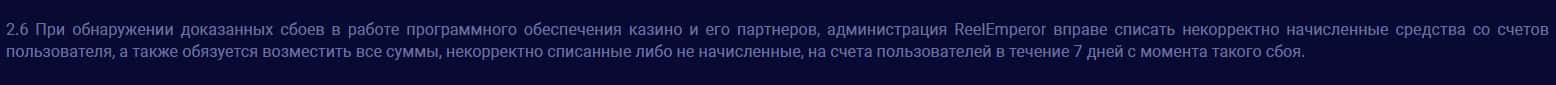 Если псевдо-казино ReelEmperor посчитает, что игрок выиграл деньги благодаря сбоям в программном обеспечении, то они вправе аннулировать его прибыль.