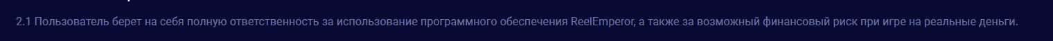Также контора ReelEmperor полностью снимает с себя ответственность за использование программного обеспечения клиентами и за все финансовые риски, которые угрожают игроку.
