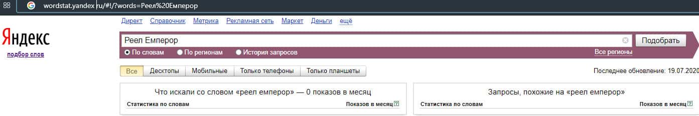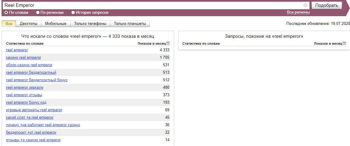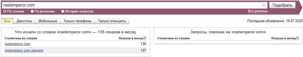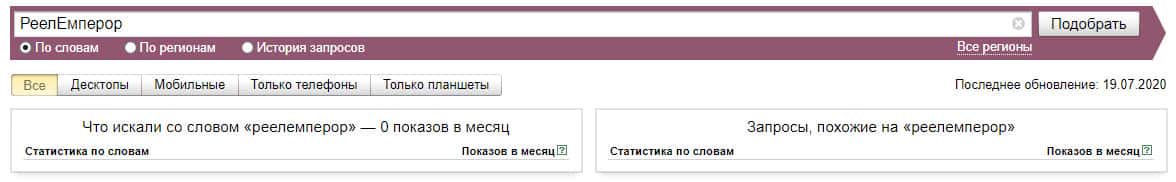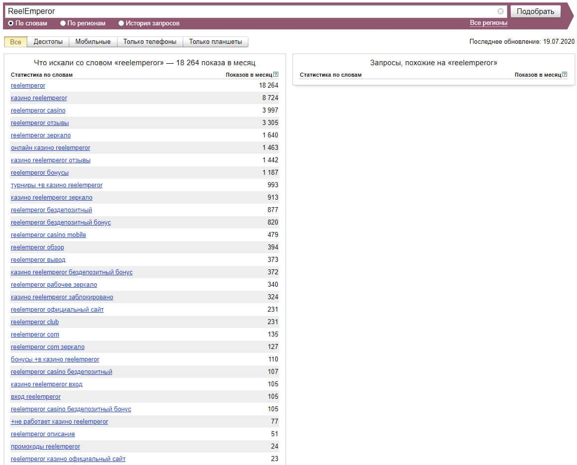 Также и ситуация и с брендом "Reel Emperor", который также не менее популярен по версии Яндекс.Вордстат, поэтому следует обратить на это внимание и быть осторожным.