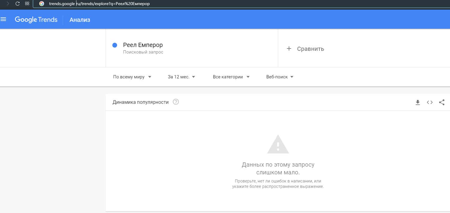 Бренд "Реел Емперор" по запросам не набрал ни одного значения, поэтому они в Гугл не такие уж и популярны как кажется на первый взгляд.