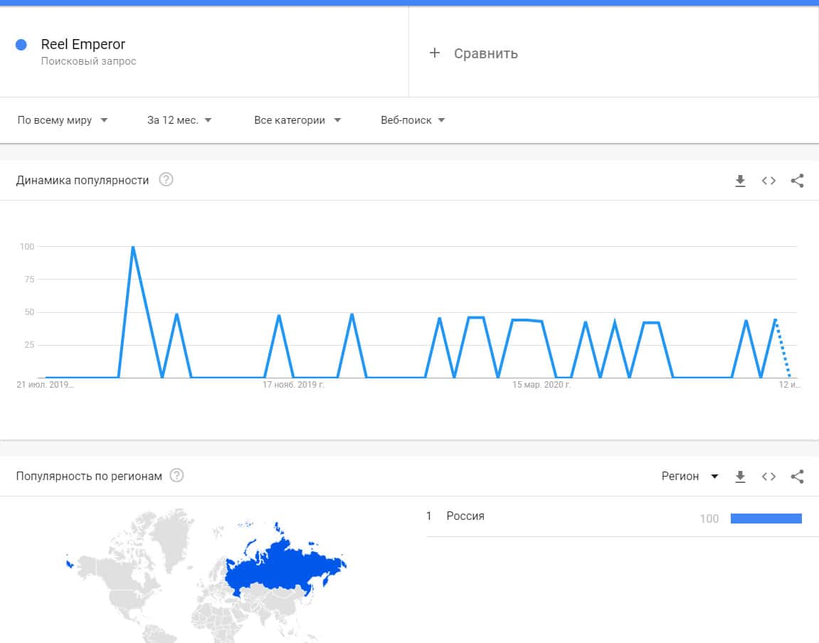 Бренд с пробелом "Reel Emperor" также имеют кое-какие запросы из России в поисковой системе Гугл, но это не значит, что компания пользуется какой-то популярностью.