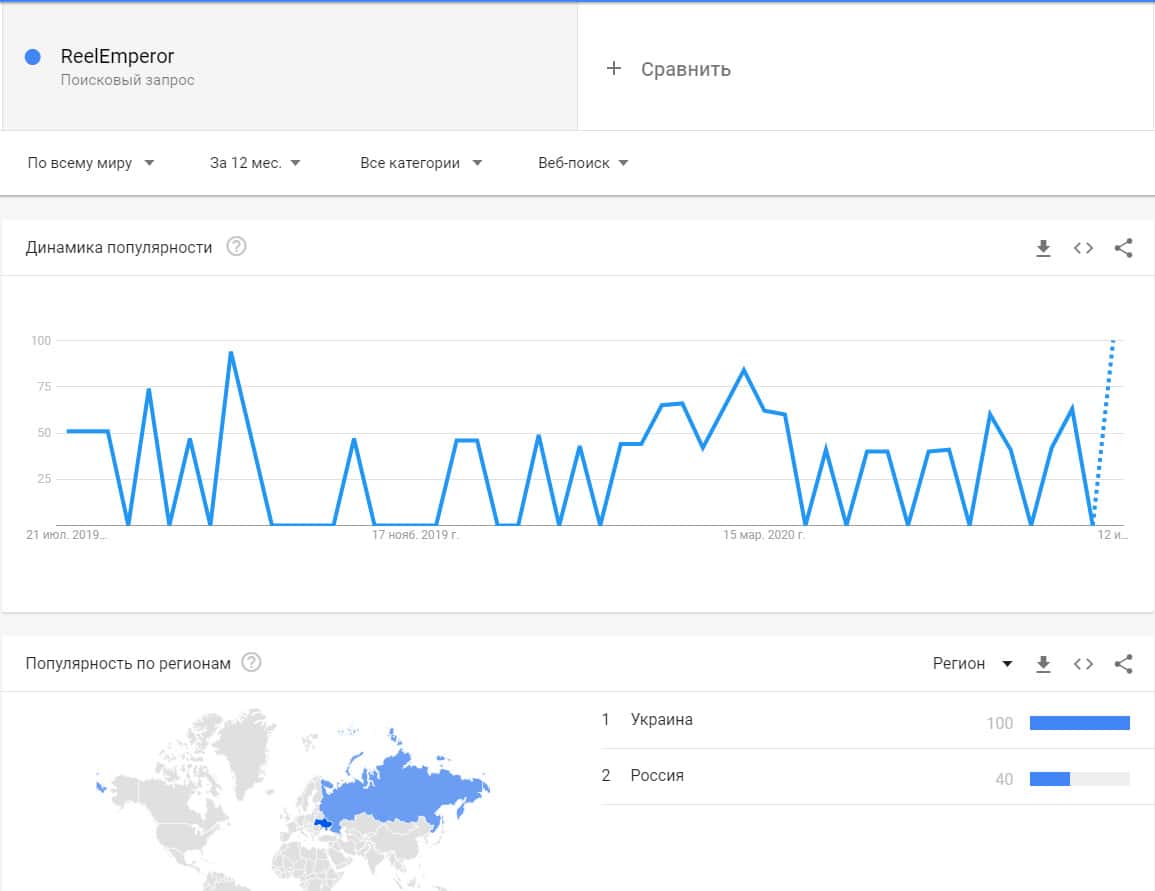 Как мы видим бренд "ReelEmperor" в гугл-запросах довольно популярен и эти запросы исходят в основном из Украины и России. В этих странах данная афера самая популярная.