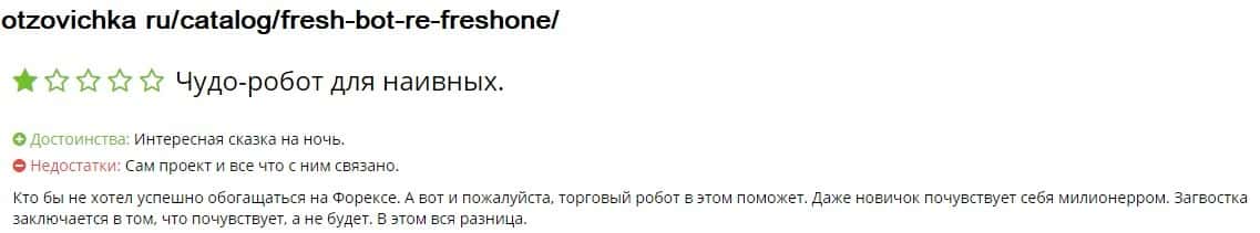 Re-Fresh One - мошеннический проект, который предлагает людям зарабатывать на валютном рынке с помощью своего робота. Причем обещают доходность в 40% в месяц. В реале же, это просто обыкновенные аферисты и лоховоды. Они еще связаны с таким лохотроном, как Black-diamond pro, которые тоже позиционируют себя, как сервис для автоматизации трейдинга. В любом случае, связываться с ними опасно и покупать их робота тоже, вы потеряете деньги.