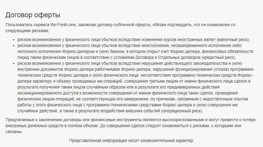 На сайте мошенников re-fresh one размещен краткий договор, в котором клиент по сути соглашается с тем, что если он работает с Re-Fresh One, то может потерять все деньги.