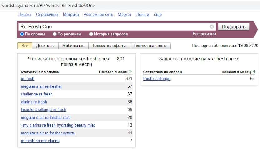 Начинаем с запросов на английском языке. Первый запрос на английском в Яндекс с пробелом "Re-Fresh One" выдает результат в 301 показ в месяц.