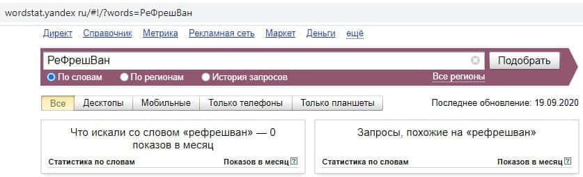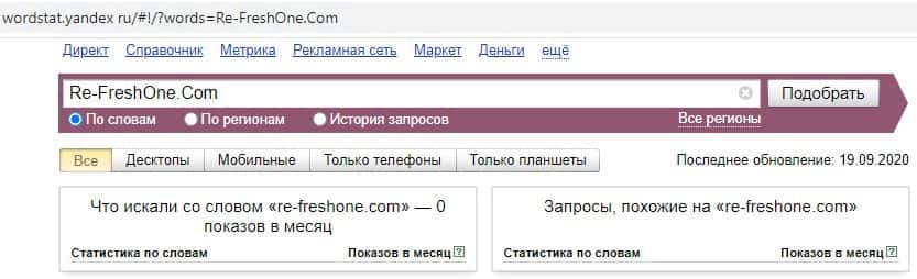 Третий запрос в яндексе на английском языке с одним пробелом "Re-FreshOne Com" выдает результат, как и в прошлый раз - 0 показов в месяц.