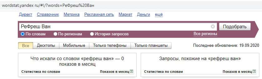 Переходим к запросам на русском языке. Первый запрос на русском языке с двумя пробелами "Ре Фреш Ван" выдает результат в 0 показов в месяц.