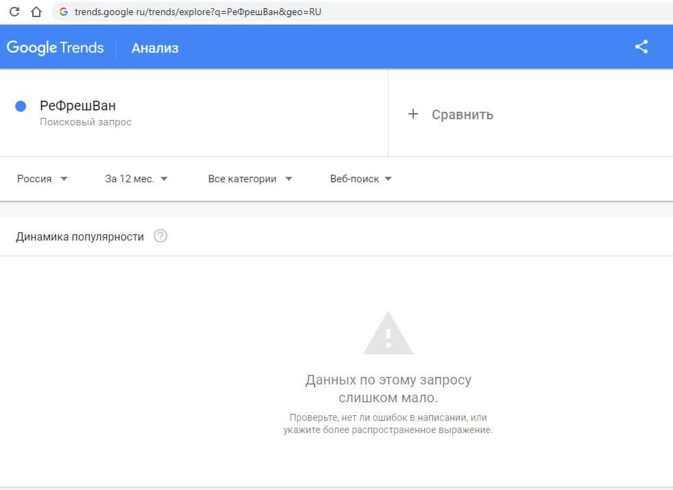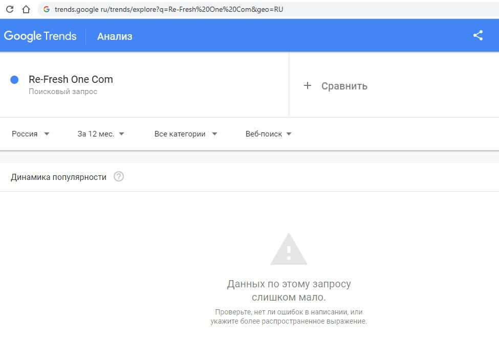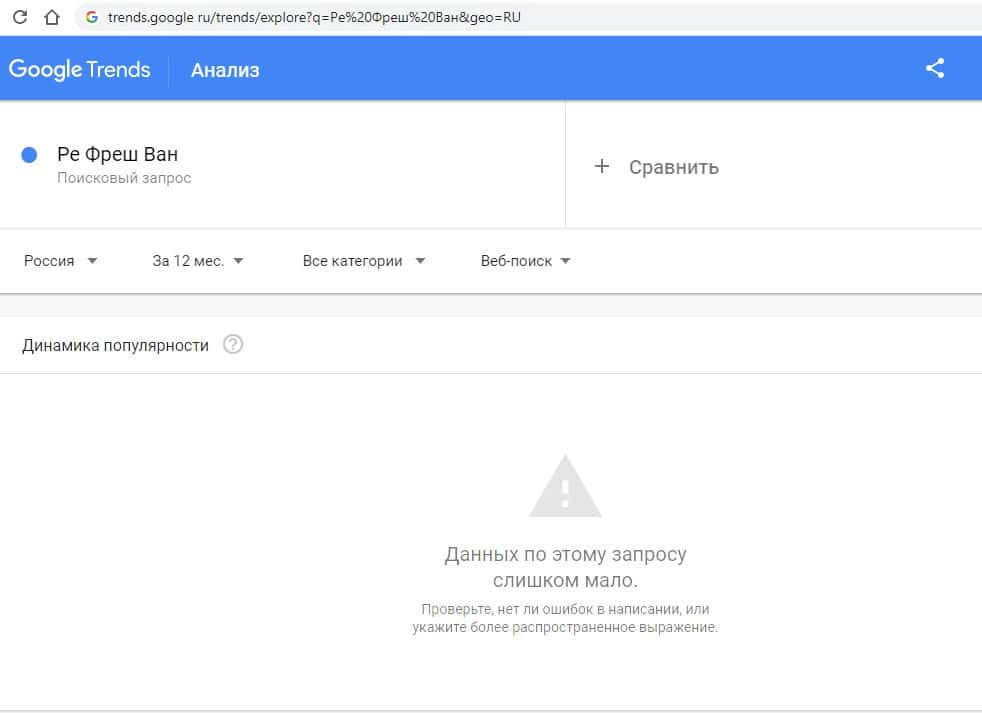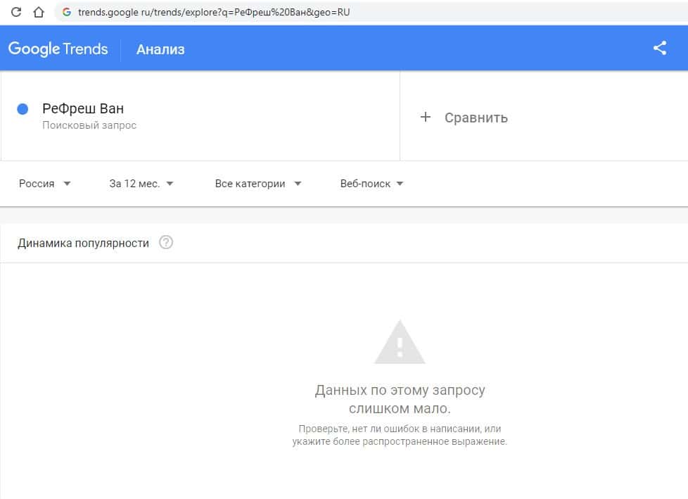Такой же запрос на русском языке в Google с одним пробелом "РеФреш Ван" выдает результат в 0 показов в месяц. Так информацию никто о жуликах не ищет.И последний запрос в Гугл на русском языке без пробелов "РеФрешВан" выдает результат в 0 показов в месяц. Так информацию о мошенниках тоже никто не ищет.