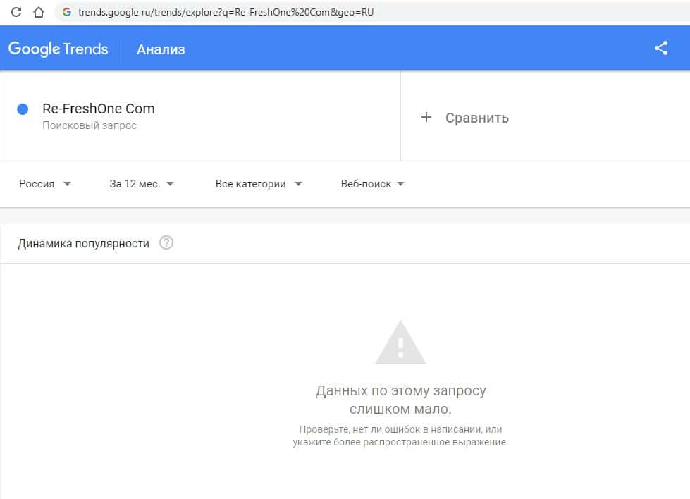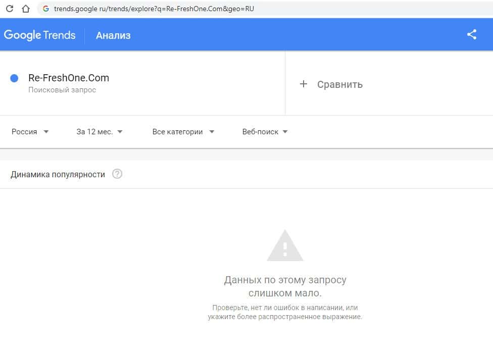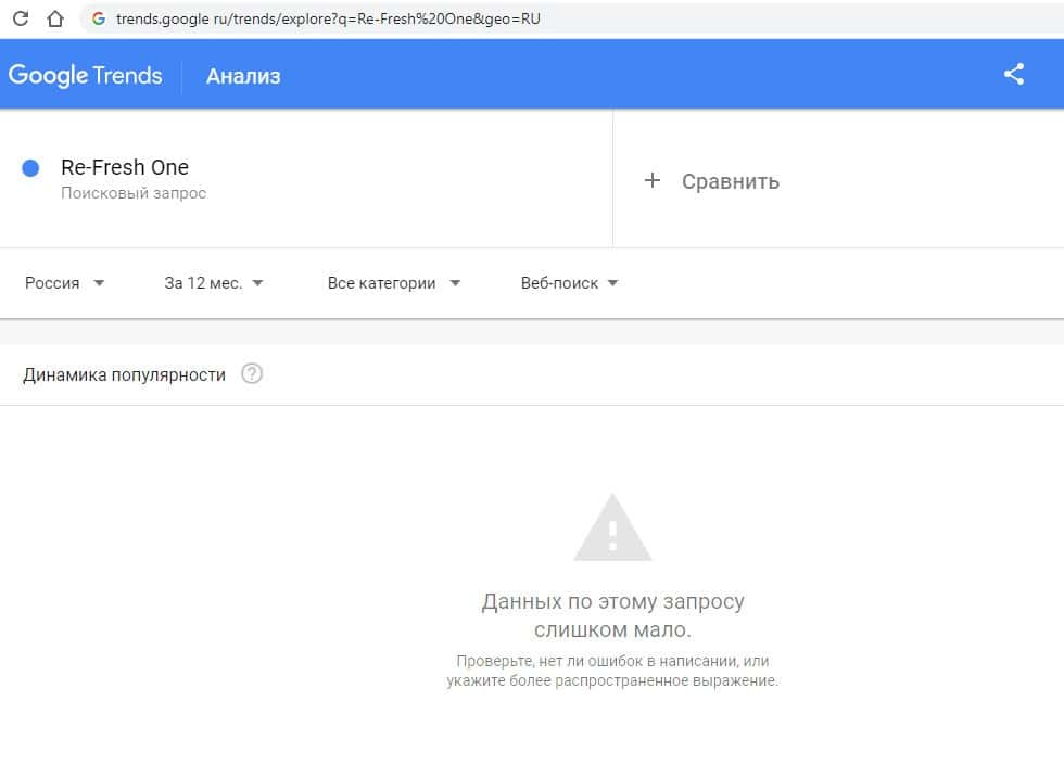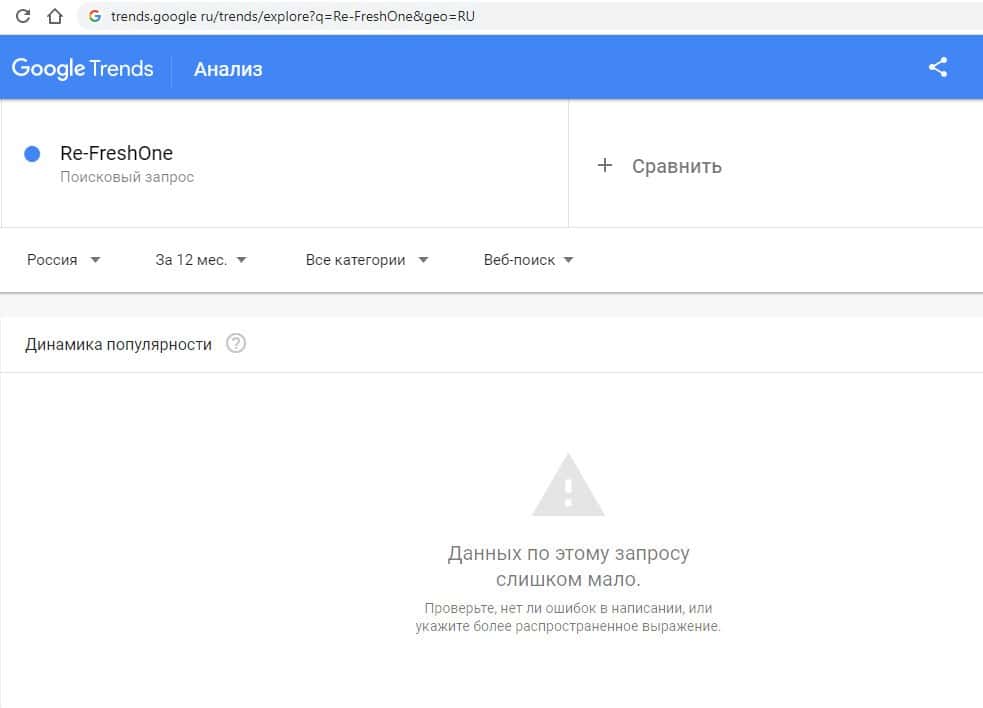 Второй запрос в Google на английском языке без пробелов "Re-FreshOne" выдает результат в 0 показов в месяц, ка и в прошлый раз.